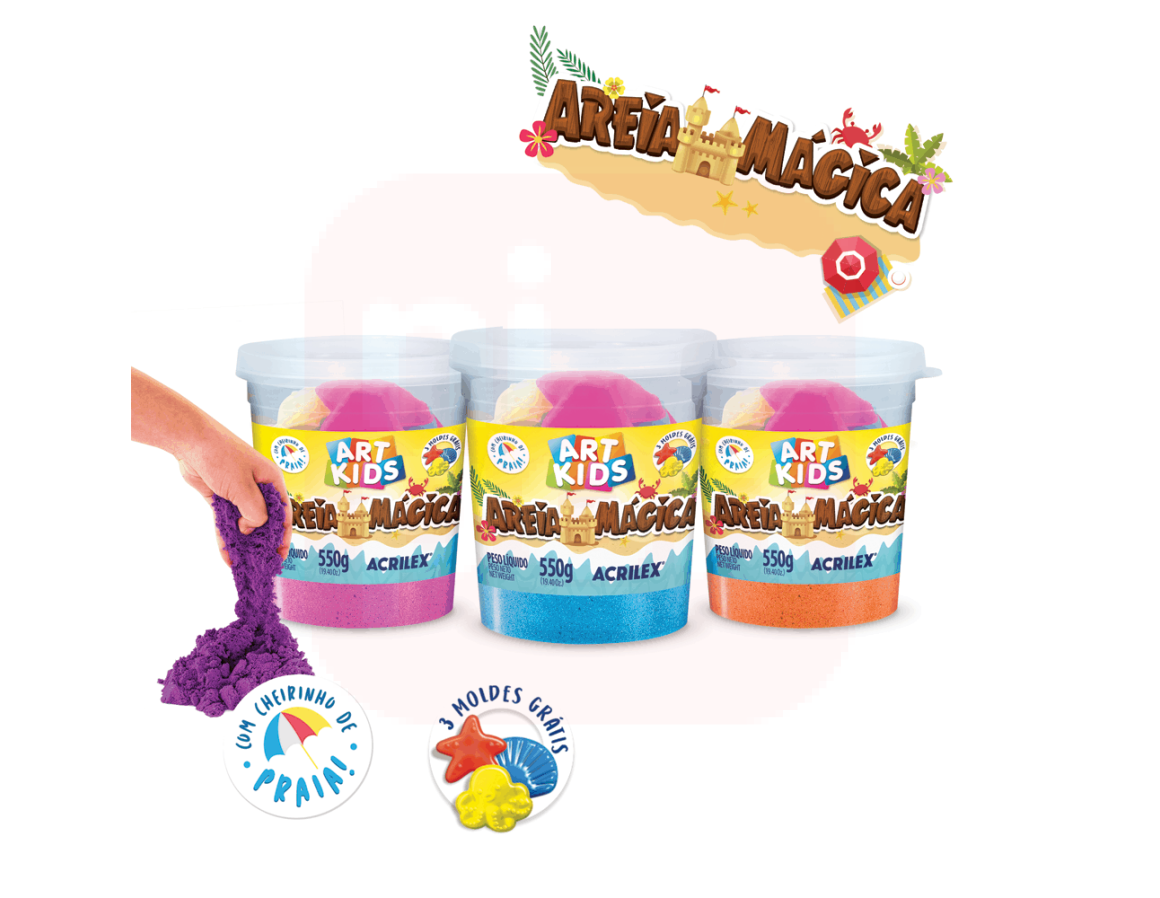Areia Mágica Natural - areia - 200g - A Areia Mágica 550g e 200g proporciona as crianças, uma incrível experiência sensorial, desenvolve a coordenação motora, habilidades manuais e a criatividade. Vem com uma forminha com tema praia para modelar. Características Gerais do Produto: • EAN: 7891153099750 • Marca: Acrilex • Idade recomendada: 3 anos e acima • Dimensões: 8 x 7,5 cm Acompanha o produto: • 1 unidade de Areia Mágica com 1 molde. Garantia: • Sem Garantia