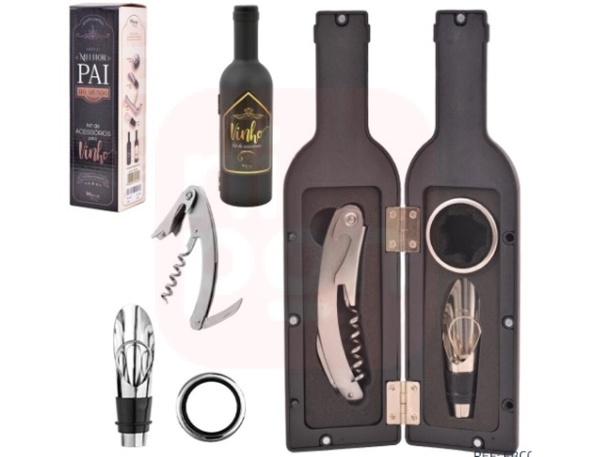 Kit Para Vinho Com Saca Rolha + Anel Corta Gotas 3 Acessorios No Estojo Garrafa Pai